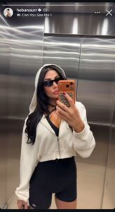 ظهرت هبة نور بإطلالة رياضية أنيقة وعصرية داخل المصعد، مرتدية هودي أبيض قصير مع شورت أسود ضيق، وأكملت مظهرها بنظارات شمسية داكنة، مما أعطى إطلالتها لمسة من الجرأة والأناقة العملية.