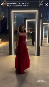 ظهرت فاليري بإطلالة راقية وجذابة، مرتدية فستانًا أحمر طويلًا من توقيع المصمم اللبناني العالمي إيلي صعب، تميّز بقصّة أنثوية ناعمة وتفاصيل بسيطة أضفت عليه لمسة من الفخامة والرقي.