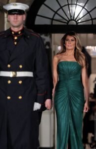 استقبلت السيدة الأميركية الأولى ميلانيا ترامب، برفقة زوجها الرئيس الأميركي دونالد ترامب، ولي العهد السعودي الأمير محمد بن سلمان في البيت الأبيض مساء الثلاثاء، حيث ظهرت بفستان سهرة أنيق باللون الأخضر من توقيع المصمّم اللبناني إيلي صعب.
