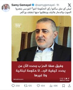 ردّ رئيس حزب الكتائب اللبنانية النائب سامي الجميّل عبر منصة “إكس” على الكلام الأخير للمسؤول في حزب الله وفيق صفا عقب غارة الضاحية، وكتب: “ليش أي متى سألتوا رأي الحكومة انتو؟ انتو بس بتجروا الموت والدمار عالبلد وبتطلبوا منها تنضّف وراكم.”.