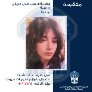 تُعمِّم المديريّة العامّة لقوى الأمن الدّاخلي بناءً على إشارة القضاء المختص صورة المفقودة القاصر