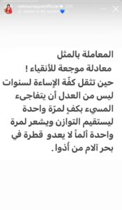 شاركت الإعلامية رابعة الزيات عبر خاصية «الستوري» على حسابها في إنستغرام اقتباسًا لافتًا عن العدالة والمعاملة بالمثل، شددت فيه على أن كفة الإساءة المتراكمة لسنوات لا يمكن أن يعادلها تصرّف واحد، معتبرة أن تحقيق التوازن لا يمحو ألمًا تراكم حتى صار «بحرًا من الأذى».