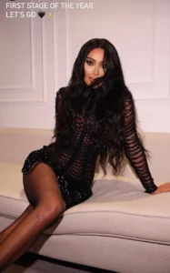 واختارت مايا لهذا الحفل فستاناً ناعماً بتصميم عصري باللون الأسود، وجاء بتصميم قصير وبقماش مخرم وضيق من الأعلى مع أكمام من الشبك المخرم، وأضيف إليه على شكل تنورة قصيرة سوداء مصنوعة من الشراريب البراقة ونسقت معه كولون شفاف وبدت في غاية الرقة والأنوثة.