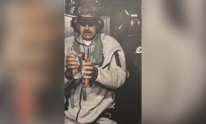 فقد أظهرت الصور التي انتشرت على نطاق واسع عبر مواقع التواصل الاجتماعي، ومن بينها صور نُشرت على حساب الرئيس الأميركي دونالد ترامب عبر منصة “تروث سوشيال”، مادورو مقيّد اليدين، مرتديًا بدلة رياضية رمادية من “Nike”، مع واقيات للأذن ونظارة تغطي عينيه.