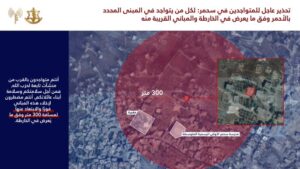‏نحث سكان المبنى المحدد بالأحمر في الخريطة المرفقة والمباني المجاورة له: أنتم تتواجدون بالقرب من مبنى يستخدمه حزب الله الإرهابي ومن أجل سلامتكم أنتم مضطرون لإخلائها فورًا والابتعاد عنها لمسافة لا تقل عن 300 متر.
