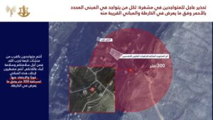 نحث سكان المبنييْن المحدديْن بالأحمر في الخريطتيْن المرفقتيْن والمباني المجاورة لهما: أنتم تتواجدون بالقرب من مباني يستخدمها حزب الله ومن أجل سلامتكم أنتم مضطرون لإخلائها فورًا والابتعاد عنها لمسافة لا تقل عن 300 متر.
