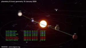 نشر راصد الزلازل الهولندي فرانك هوغربيتس، مساء أمس السبت، صورة تظهر اصطفاف عدد من الكواكب، بينها الزهرة وعطارد والمريخ والمشتري، واقترانها مع الأرض والشمس والقمر، مشيراً إلى أن تلك هي هندسة الكواكب التي يشهدها الفضاء اليوم الأحد 18 كانون الثاني. كما توقع في تدوينة أخرى على قنواته بمواقع التواصل، بحدوث زلزال بقوة 8 على مقياس ريختر، محدداً بلداً بعينه.
