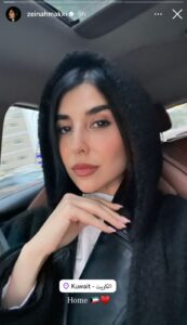 نشرت الممثلة زينة مكّي صورة جديدة من داخل سيارتها عبر حسابها على إنستغرام، معلقة عليها بعبارة “Home” مع علم الكويت وقلب أحمر، مما يشير إلى عودتها أو تواجدها في الكويت.