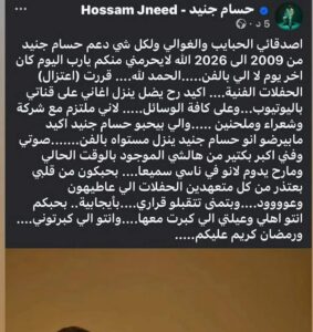 وكتب جنيد في منشور الاعتزال على حساباته على مواقع التواصل الاجتماعي: “لكل شخص دعم حسام حنيد من 2009 إلى 2026 الله لا يحرمني منكم يا رب، اليوم كان آخر يوم لإلي بالفن، الحمد لله قررت اعتزال الحفلات الفنية. أكيد رح يضل ينزل أغاني على قناتي باليوتيوب وعلى كافة الوسائل لأني ملتزم مع