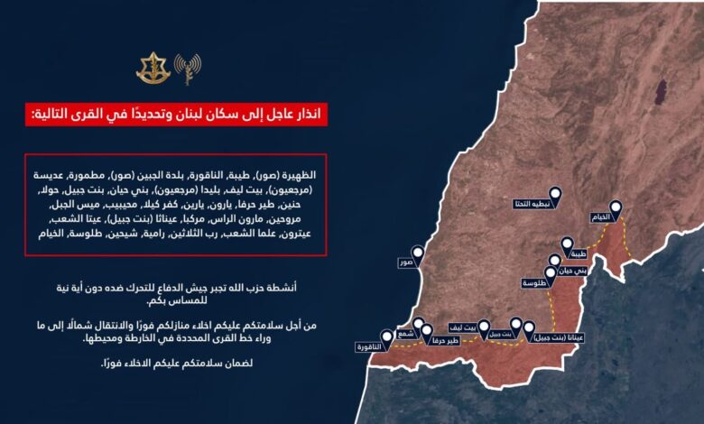 عاجل: انذار عاجل إلى سكان لبنان وتحديدًا في القرى التالية: