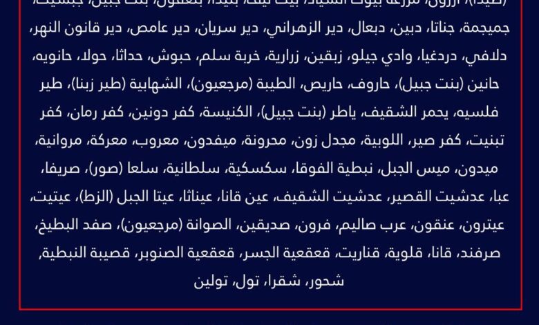 ‏ عاجل: انذار عاجل إلى سكان لبنان – إليكم قائمة القرى والبلدات التي تم تحذيرها ونطلب منكم عدم العودة اليها