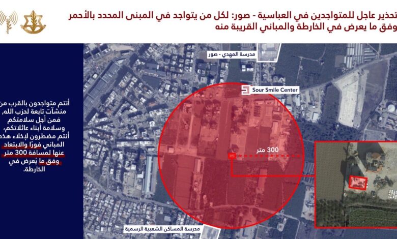 نحث سكان المباني المحددة بالأحمر في الخريطتيْن المرفقتيْن والمباني المجاورة لها: أنتم تتواجدون بالقرب من مباني يستخدمها حزب الله فمن أجل سلامتكم أنتم مضطرون لإخلائها فورًا والابتعاد عنها لمسافة لا تقل عن 300 متر