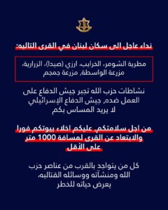 انذار عاجل الى سكان لبنان في القرى التالية: