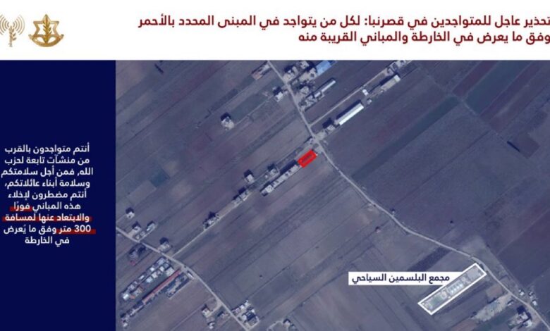 نحث سكان المبنى المحدد بالأحمر في الخريطة المرفقة والمباني المجاورة له: أنتم تتواجدون بالقرب من مبنى يستخدمه حزب الله فمن أجل سلامتكم أنتم مضطرون لإخلائه فورًا والابتعاد عنه لمسافة لا تقل عن 300 متر