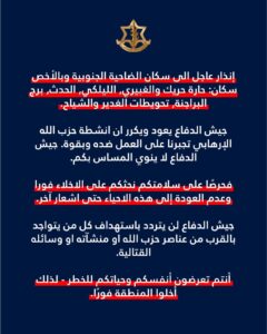 الجيش الإسـ-ـرائيلي يجدد إنذاره لسكان الضاحية الجنوبية لبيروت