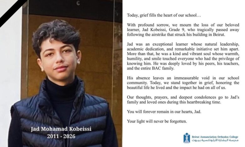 مدرسة البشارة الأرثوذكسية-بيروت تنعى تلميذها الشهيد جاد قبيسي في الصف التاسع الذي قتل جراء الغارة على زقاق البلاط منذ يومين