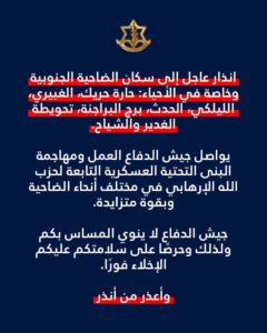انذار عاجل إلى سكان الضاحية الجنوبية وخاصة في الأحياء: