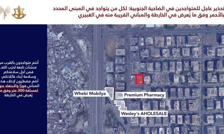 الجيش الإسرائيلي: نوجّه إنذارًا عاجلًا للمتواجدين في حي الغبيري لإخلاء مبنى محدد ومبان مجاورة له فورًا لوقوعه قرب منشأة تابعة لحزب الله