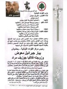 حدّدت عائلة المسؤول في “القوات اللبنانية” بيار جبرائيل معوض موعد تشييع جثمانه وزوجته فيلافيا جوزيف مراد، حيث يُحتفل بالصلاة لراحة نفسيهما عند الساعة الرابعة من بعد ظهر يوم غد الثلاثاء 7 نيسان في كنيسة مار سمعان العمودي – يحشوش، قبل أن يُواريا الثرى في مدافن البلدة، وفق ما ورد في ورقة النعوة.