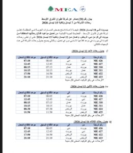 أعلنت شركة طيران الشرق الأوسط -الخطوط الجوية اللبنانية، نتيجة لاعادة فتح بعض المسارات الجوية في المنطقة، عن تعديل مواعيد اقلاع رحلاتها المنطلقة من بيروت الى كل من دبي، الرياض، وعمان من 12 نيسان ولغاية 15 نيسان 2026.