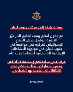 حرصًا على سلامتكم وسلامة أبناء عائلاتكم – وحتى إشعار آخر – يُطلب منكم عدم الانتقال إلى جنوب نهر الليطاني