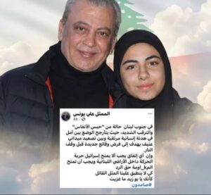 استشهد الممثل علي يونس وإبنته سيلين في غارة إسرائيلية على بلدة اللوبية مساء أمس الخميس وذلك قبل نصف ساعة فقط من دخول وقف إطلاق النار حيز التفيذ.