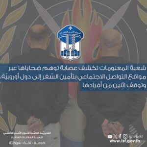 في إطار المتابعة المستمرّة التي تقوم بها قطعات قوى الأمن الدّاخلي لمكافحة الجرائم في مختلف المناطق اللّبنانية، توافرت معلومات لدى شعبة المعلومات حول نشاط عصابة ينفّذ أفرادها عمليّات نصب واحتيال تستهدف أشخاصًا من التّابعيّة السّوريّة، وذلك بعد استدراجهم عبر حِسابات وهميّة على مواقع التّواصل الاجتماعي، وإيهامهم بإمكانيّة تأمين سفرِهم الى الدّول الأوروبيّة، مقابل مبالغ ماليّة.