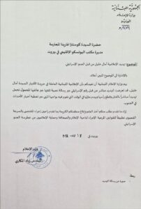 نشر وزير الإعلام السابق المهندس زياد المكاري على منصة “أكس”، الرسالة التي وجهها الى مديرة مكتب اليونيسكو الاقليمي في بيروت، كوستانزا فارينا، في تاريخ ١٧ ايلول ٢.٢٣، حين تلقت الصحافية آمال خليل اتصالاً من رقم إسرائيلي يهددها بالقتل وتحديداً بـ”قطع رأسها” وهدم منزلها، طالباً أخذ الاجراءات الدولية اللازمة لحماية الصحافيين.