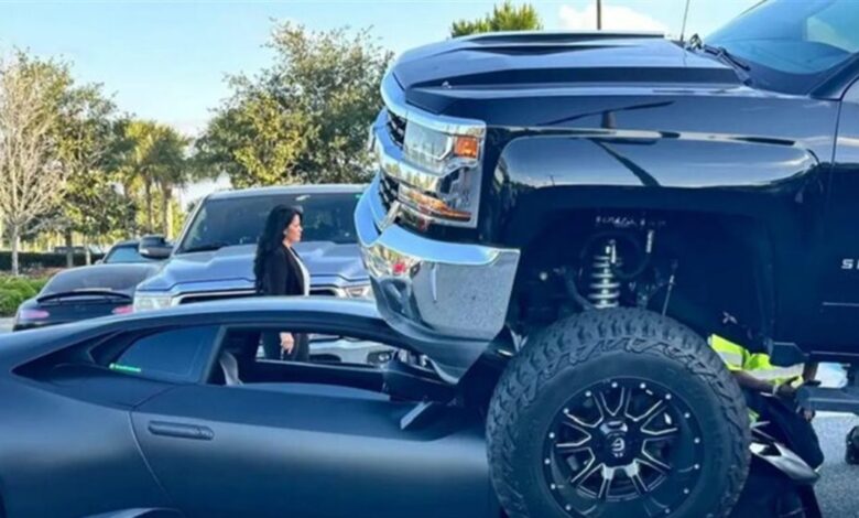 دهست سيدة تقود شاحنة تزن 3 أطنان سيارة لامبورغيني قيمتها نحو 340 ألف دولار في موقف سيارات بفلوريدا.