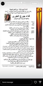 يحتفل بالصلاة لراحة نفس الفقيدة عند الساعة العاشرة والنصف من قبل ظهر يوم السبت 2 أيار، في كنيسة مار تقلا – جل الديب.