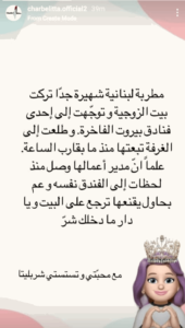 كشفت صفحة “شربليتا” المختصة بأخبار المشاهير عبر تطبيق انستغرام ان مطربة لبنانية شهيرة جدا تركت منزلها الزوجي وتوجهت إلى أحد فنادق بيروت.