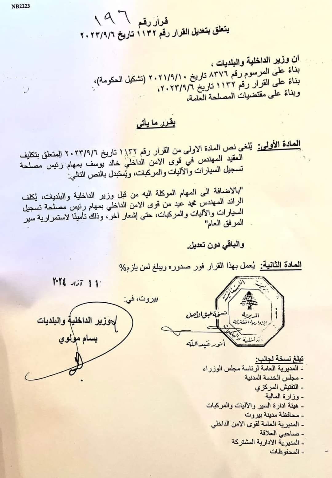 ألغى وزير الداخلية والبلديات في حكومة تصريف الأعمال بسام مولوي القرار رقم 1132 تاريخ 9-6-2023 المتعلق بتكليف العقيد المهندس في قوى الأمن الداخلي خالد يوسف بمهام رئيس مصلحة تسجيل السيارات والآليات والمركبات.