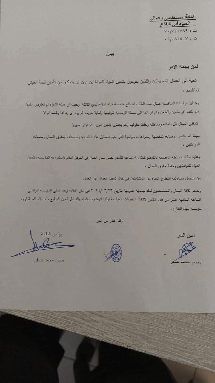 توجهت نقابة مستخدمي وعمال المياه في البقاع بتحذير هدّدت من خلاله بقطع المياه عن المشتركين في حال لم يتم توقيع مناقصة عمال غب الطلب لمصلحة المؤسسة.