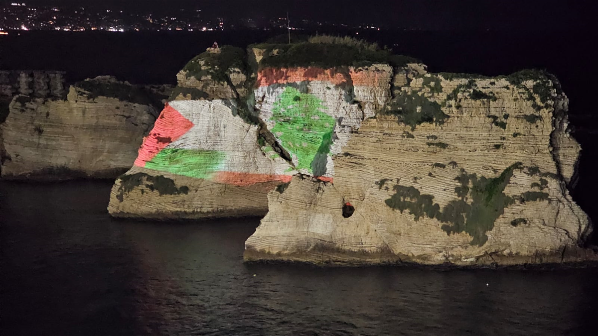 أضيئت صخرة الروشة في بيروت، مساء اليوم الجمعة، بالعلمين اللبناني والفلسطيني، وذلك بمناسبة “يوم القدس العالمي” وتضامناً مع غزة التي تواجه حرباً ضد إسرائيل من 7 تشرين الأول الماضي.