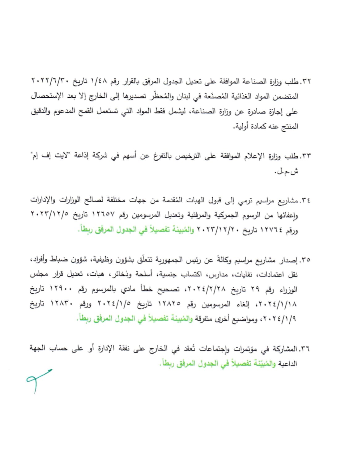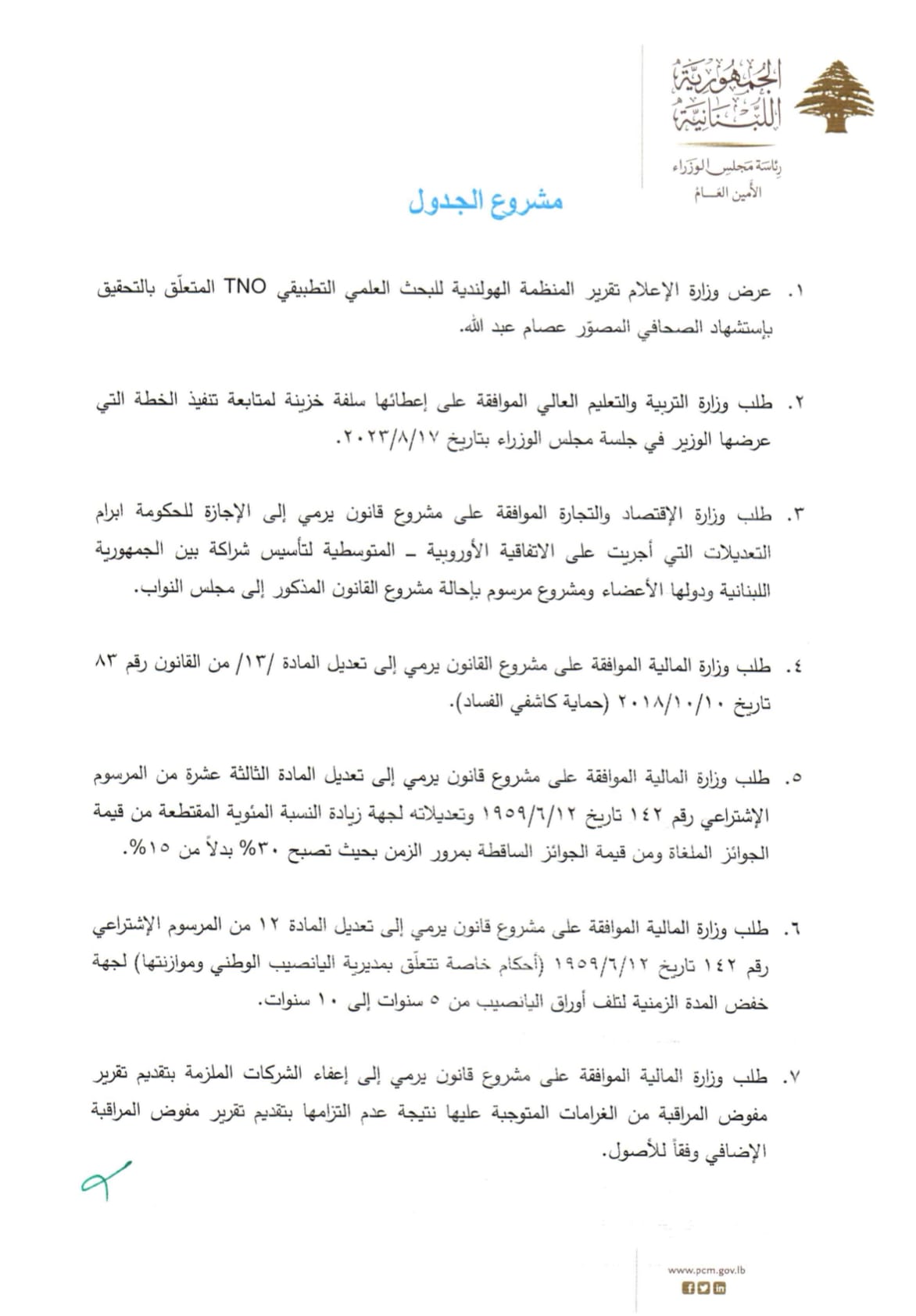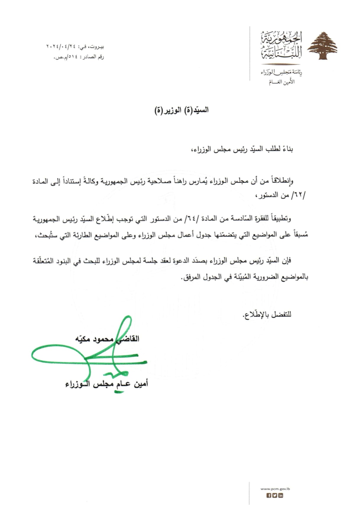 “بناء لطلب السيد رئيس مجلس الوزراء، وإنطلاقاً من أن مجلس الوزراء يُمارس راهناً صلاحية رئيس الجمهورية وكالة استناداً إلى المادة 62 من الدستور، وتطبيقاً للفقرة السادسة من المادة 64 من الدستور التي توجب إطلاع السيد رئيس الجمهورية مُسبقاً على المواضيع التي يتضمنها جدول أعمال مجلس الوزراء وعلى المواضيع الطارئة التي ستُبحث، فإن السيد رئيس مجلس الوزراء نجيب ميقاتي بصدد الدعوة لعقد جلسة لمجلس الوزراء للبحث في البنود المتعلقة بمواضيع ضرورية.