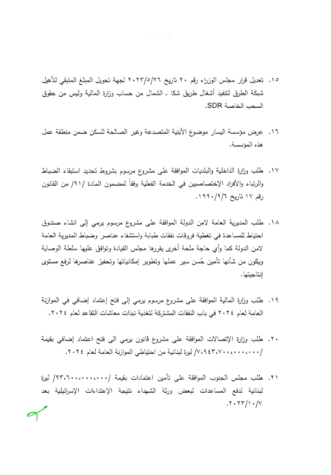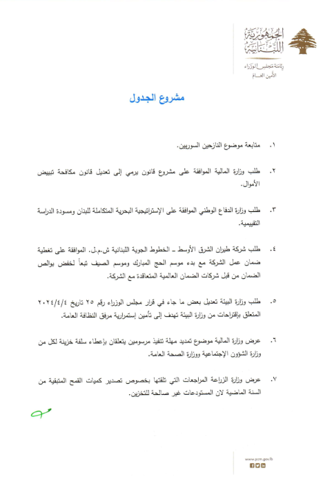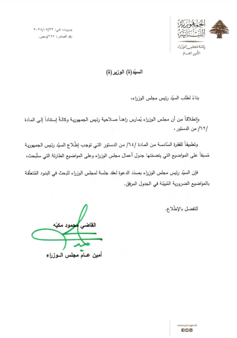 “بناء لطلب السيد رئيس مجلس الوزراء، وإنطلاقاً من أن مجلس الوزراء يُمارس راهناً صلاحية رئيس الجمهورية وكالة استناداً إلى المادة 62 من الدستور، وتطبيقاً للفقرة السادسة من المادة 64 من الدستور التي توجب إطلاع السيد رئيس الجمهورية مُسبقاً على المواضيع التي يتضمنها جدول أعمال مجلس الوزراء وعلى المواضيع الطارئة التي ستُبحث، فإن السيد رئيس مجلس الوزراء نجيب ميقاتي بصدد الدعوة لعقد جلسة لمجلس الوزراء للبحث في البنود المتعلقة بمواضيع ضرورية.”