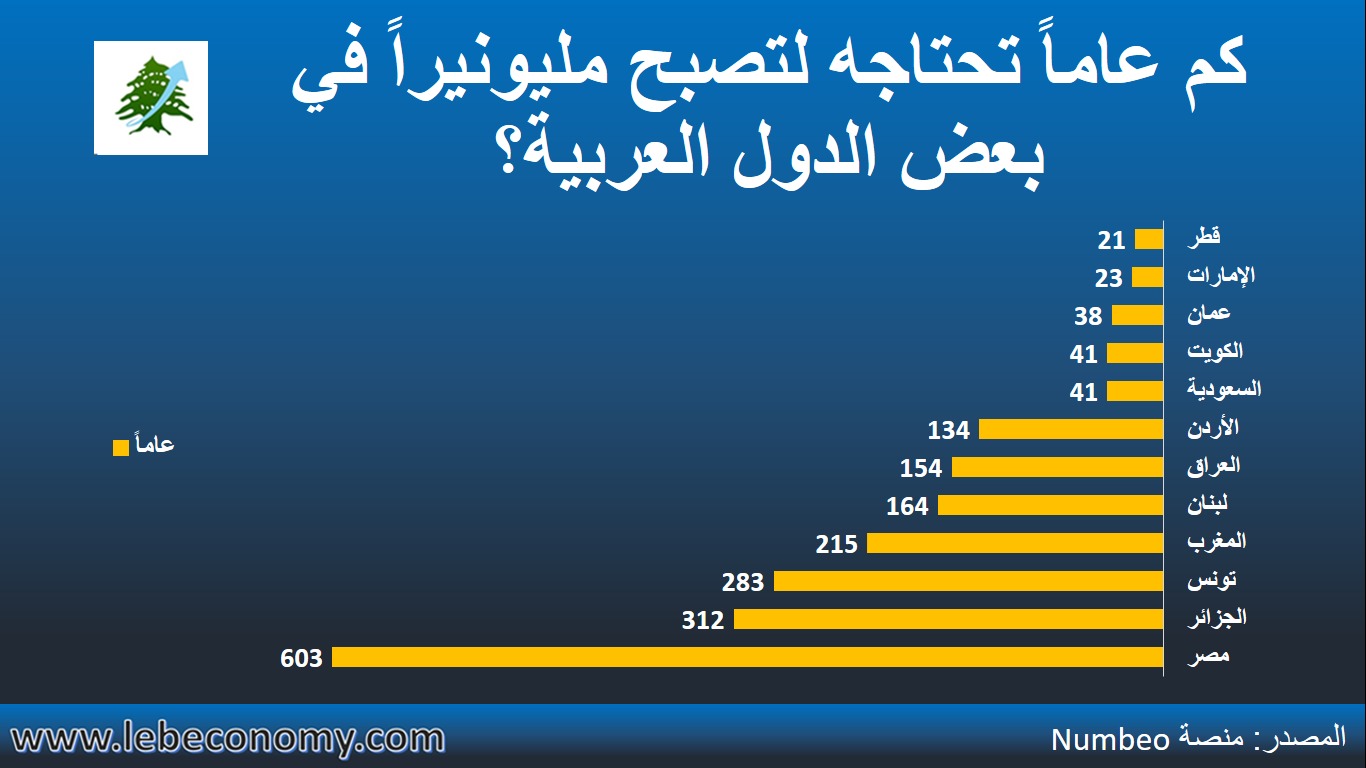 كشفت دراسة إعتمدت على بيانات متوسط الأجر الشهري من منصة Numbeo عن ان المواطن اللبناني يحتاج إلى 164 عاماً و 3 اشهر ليصبح مليونيراً في بلده.