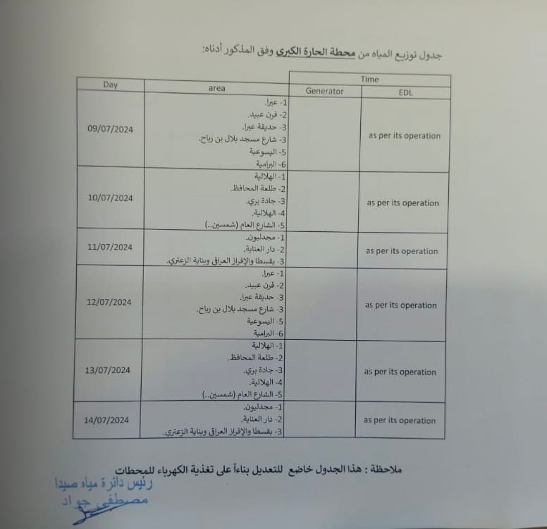 بالصورة: “بسبب تعطل مضختين في صيدا”… مياه الجنوب: اعتماد جدول موقت لتوزيع المياه