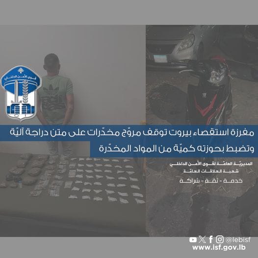 في إطار المتابعة التي تقوم بها قوى الأمن الدّاخلي لتوقيف المتورطين بتجارة وترويج المخدرات في مدينة بيروت، توافرت معلومات لدى مفرزة استقصاء بيروت حول قيام شخص بترويج مواد مخدّرة، على متن دراجة آليّة، في محلّة الرّملة البيضاء.