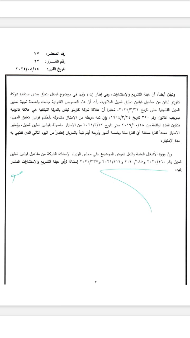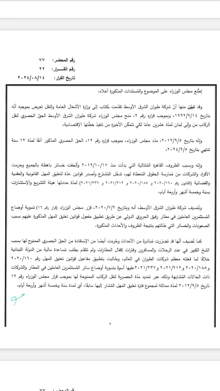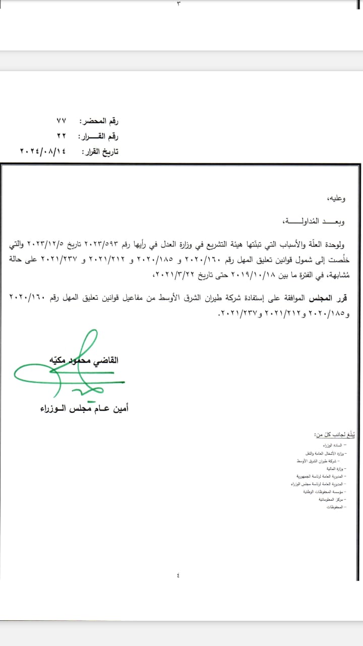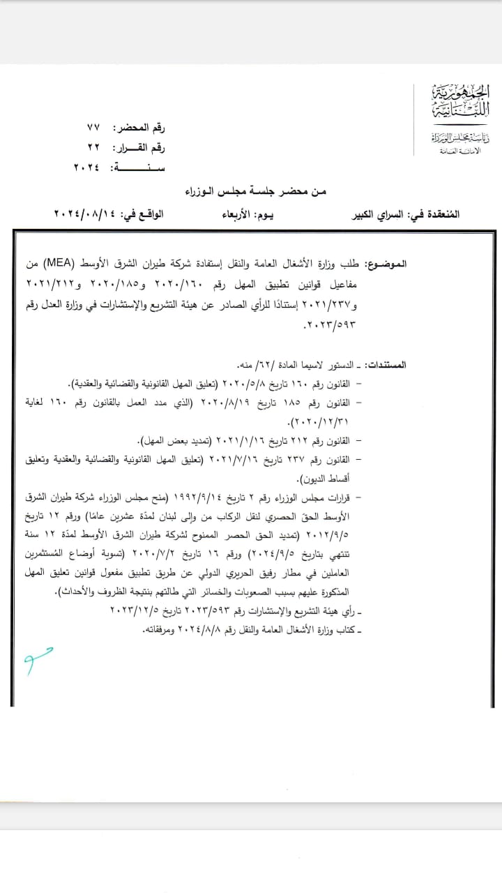 قرّر مجلس الوزراء في جلسته التي انعقدت اليوم في السرايا، المُوافقة على إستفادة شركة طيران الشرق الأوسط من مفاعيل قوانين تعليق المهل رقم 160/2020 و185/2020 و212/2021 و237/2021.