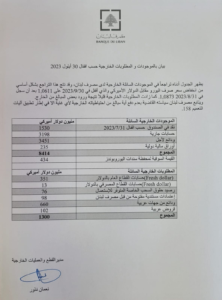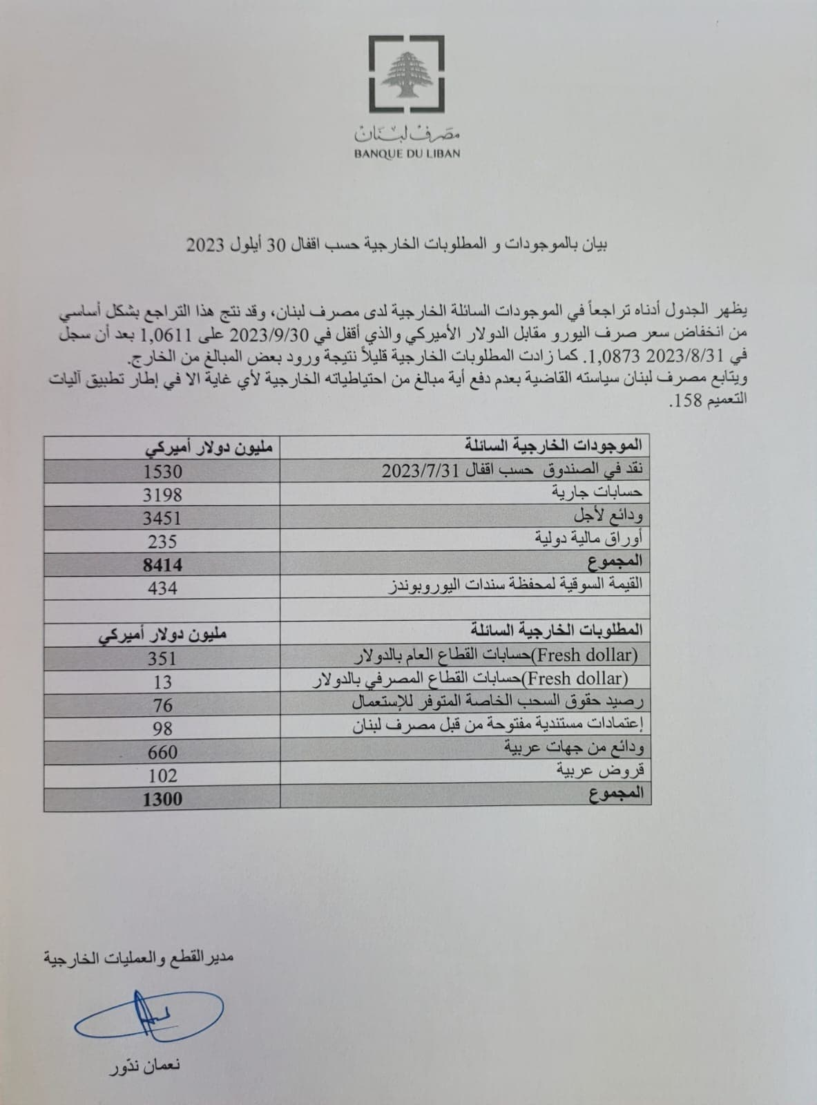 أصدر مصرف لبنان بياناً جديداً حول الموجودات والمطلوبات الخارجية حسب إقفال 30 أيلول 2023 حيث ظهر تراجعاً في الموجودات السائلة الخارجية لدى المصرف وقد نتج عن هذا التراجع بشكل أساسي من انخفاض سعر صرف اليورو مقابل الدولار الأميركي والذي أقفل في 30 أيلول على 1.0611، كما زادت المطلوبات الخارجية قليلاً نتيجة ورود بعض المبالغ من الخارج.