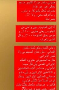 وقال معوّض في منشور عبر خاصيّة “ستوري” عبر حسابها على “انستغرام”: “صرلي سنة.. من 7 تشرين الاول ما عم بحكي غير عن غـزة. خسرت شغل بأميركا.. وناس.. وما فرقت معي.. ولا 1%.. بصراحة. أنا ابن الجنوب.. بيي وامي من الجنوب.. يعني جنوبي 100% ومؤمن بحق المقاومة وكل الناس بتعرف”.